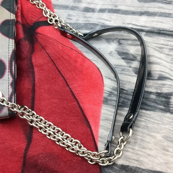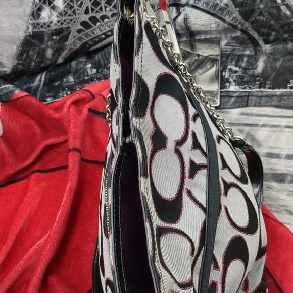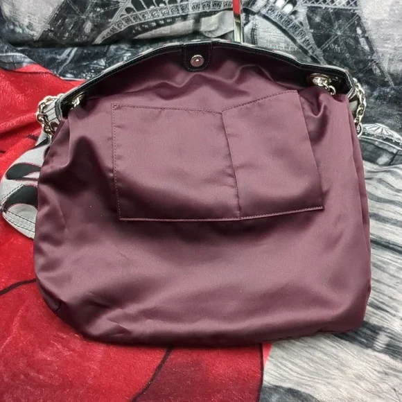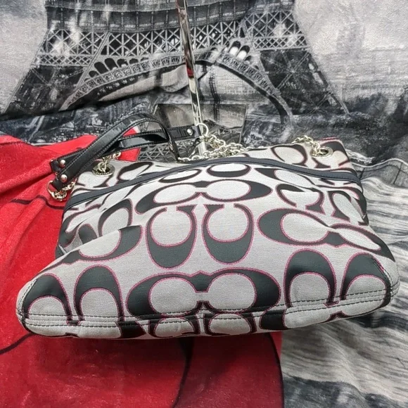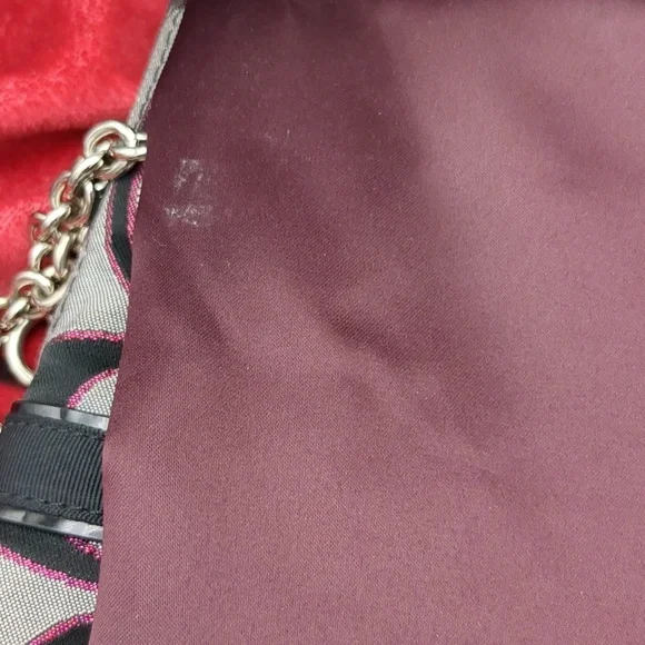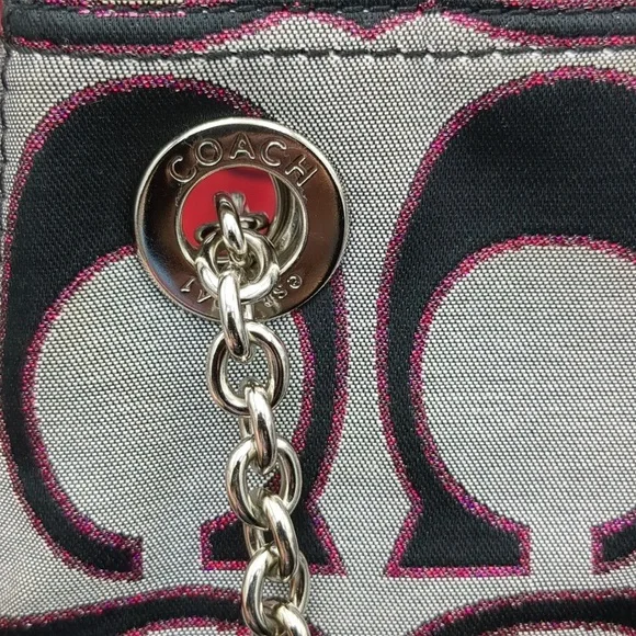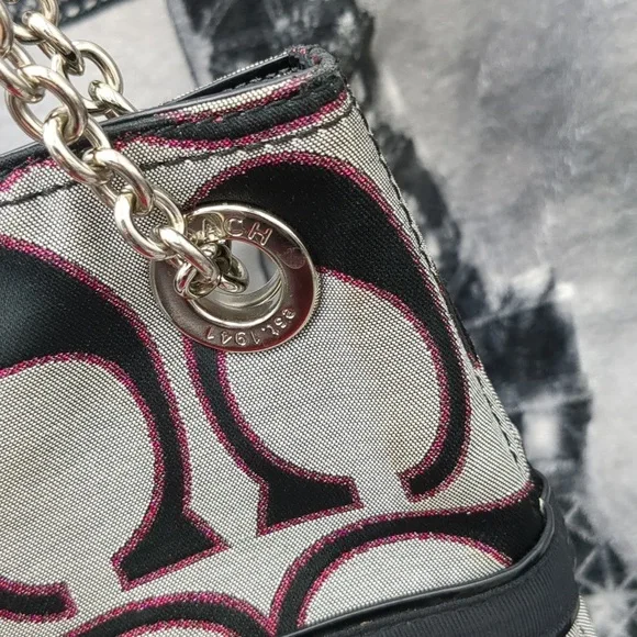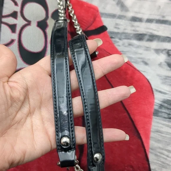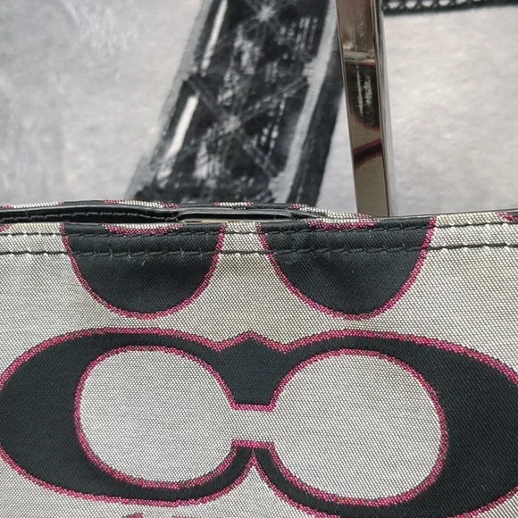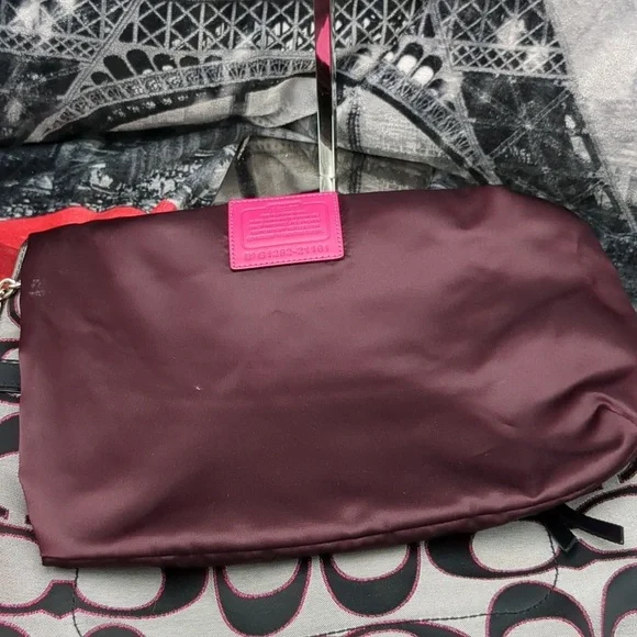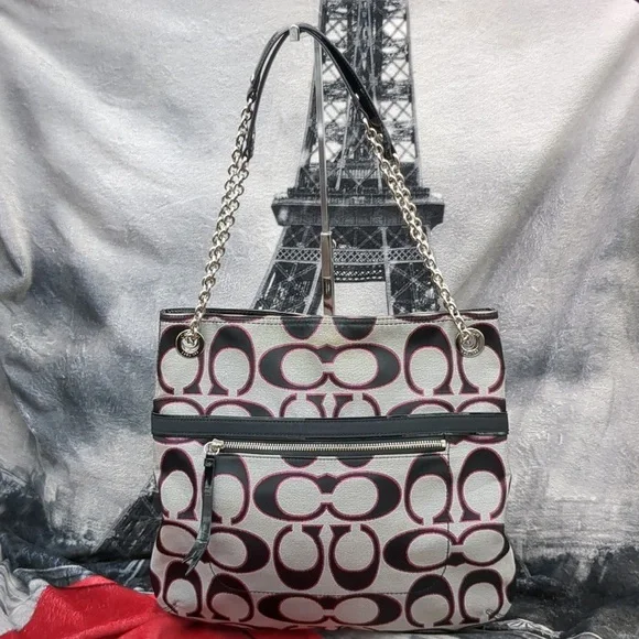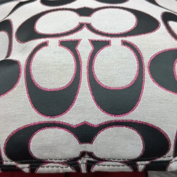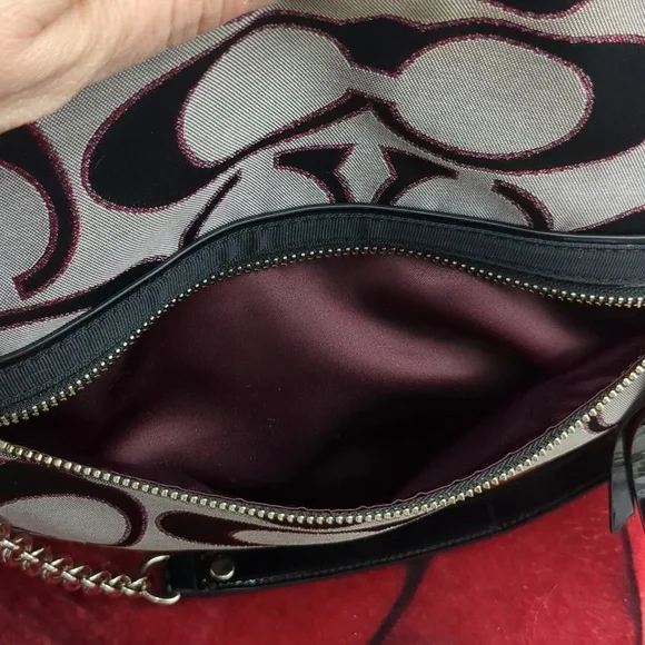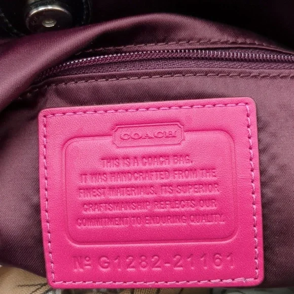 Coach 21161 with a burgundy interior which is mostly clean. The outside does have some dinge notated and near the top. this has been hand washed but some stains still remain. The straps are in great condition. This does have an extra pocket in the front for electronics. There are no hang tags with this. Straps are in great condition. approximate dimensions are 13 in in height by 14. in across drop drop is 11 in and can be converted to 17 in. please review pics and ask questions. check out the matching wallet