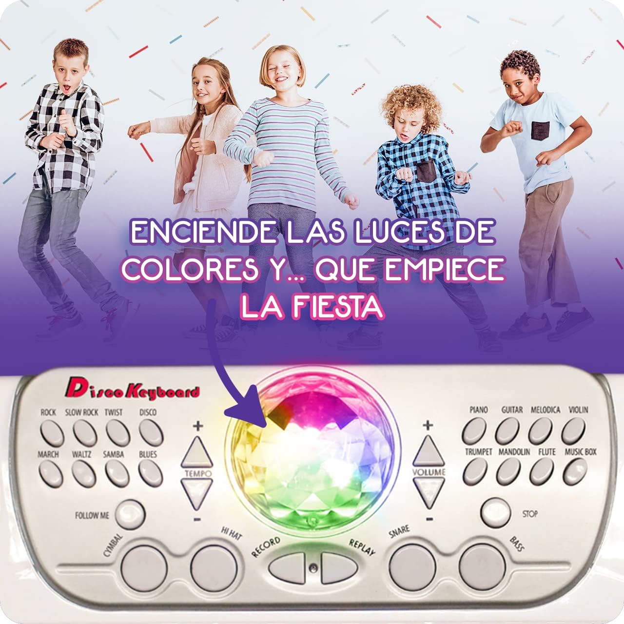 Electronic keyboard with learning method. It has 22 demo songs. Follow the lights to learn how to play! It has 37 keys with 8 selectable instruments, 8 rhythms with tempo speed control and 4 percussion sounds. In addition, it has a disco ball with flashing lights that projects the lights and the disco effect invades the place, children dance and play recreating a real dance floor and stimulate their most artistic and creative part. You can record and play, as well as control the volume of the music. It has the option of automatic shutdown to save energy. Requires 4 AA batteries (not included). The dimensions of the keyboard are 50 x 21 x 45 cm. Includes a stool for comfort during use (22cm high). Recommended for ages 3+.