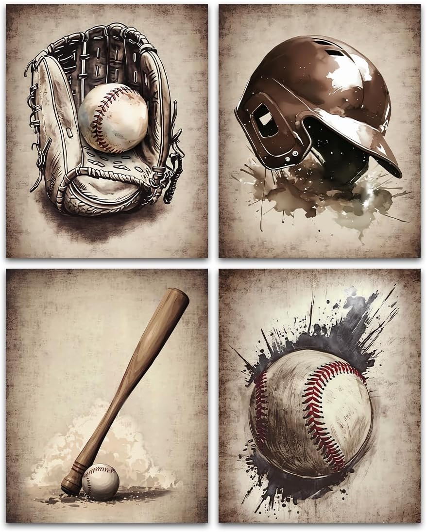 Do you want your room to be unique and artistic? Yes, our wall art prints may be a good choice ✍★Enhance your space with this set of 4 vintage baseball framed canvas wall art prints, perfect for boys sports room or gym living room bedroom decor. ✍★Featuring vintage baseball designs, adding a touch of nostalgia and charm to your walls. ✍★Each canvas print is framed and ready to hang, making it easy to decorate your space with a classic baseball theme. ✍★Ideal for baseball enthusiasts and sports lovers, these wall art pieces make a great gift for birthdays, holidays, or special occasions. ✍★Transform your room with these baseball wall decor pieces, creating a cozy and stylish atmosphere perfect for relaxing or working out.