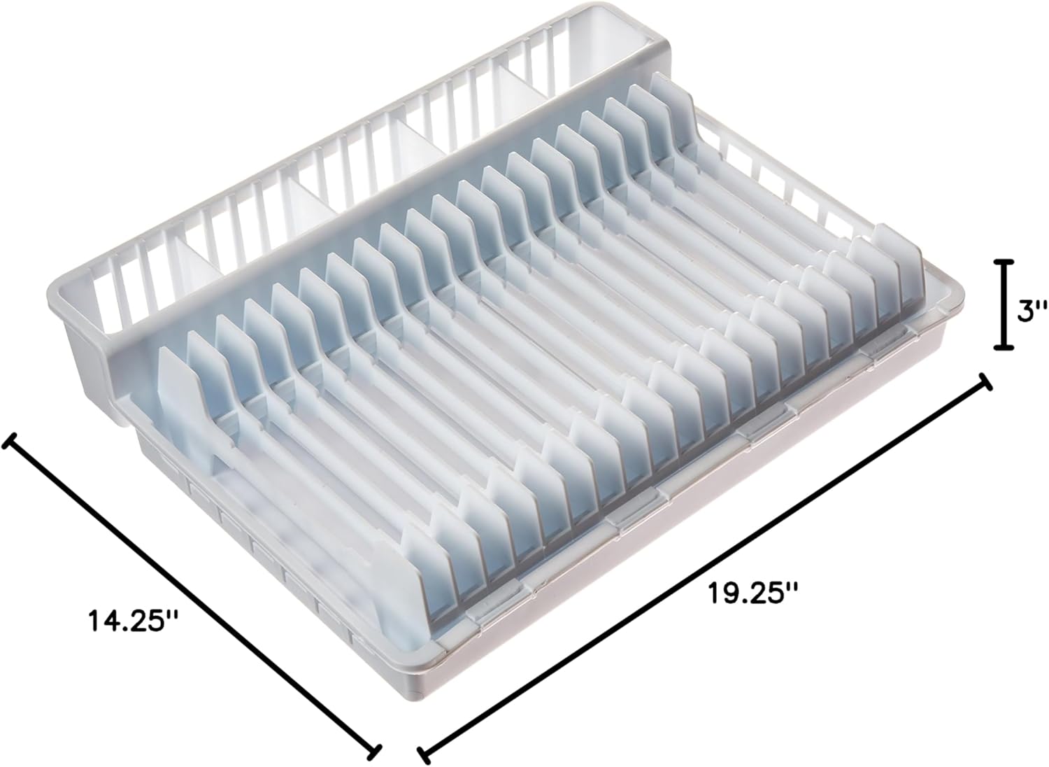 This innovative dish rack is made in Italy of ABS Plastic. The white color blends with any countertop decor. It has a hinge and can be folded to save kitchen counter space or opened to provide additional space for drying your dishes. When folded it saves space both over the kitchen counter top and for storage when not in use. The dish rack will not fade or rust. It makes drying dishes easy and it is easy to clean. The flat drip tray has a large lip and is attached to the dish rack, It can also be used for drying additional items such as glasses, mugs, large bowls, cups or cookware.