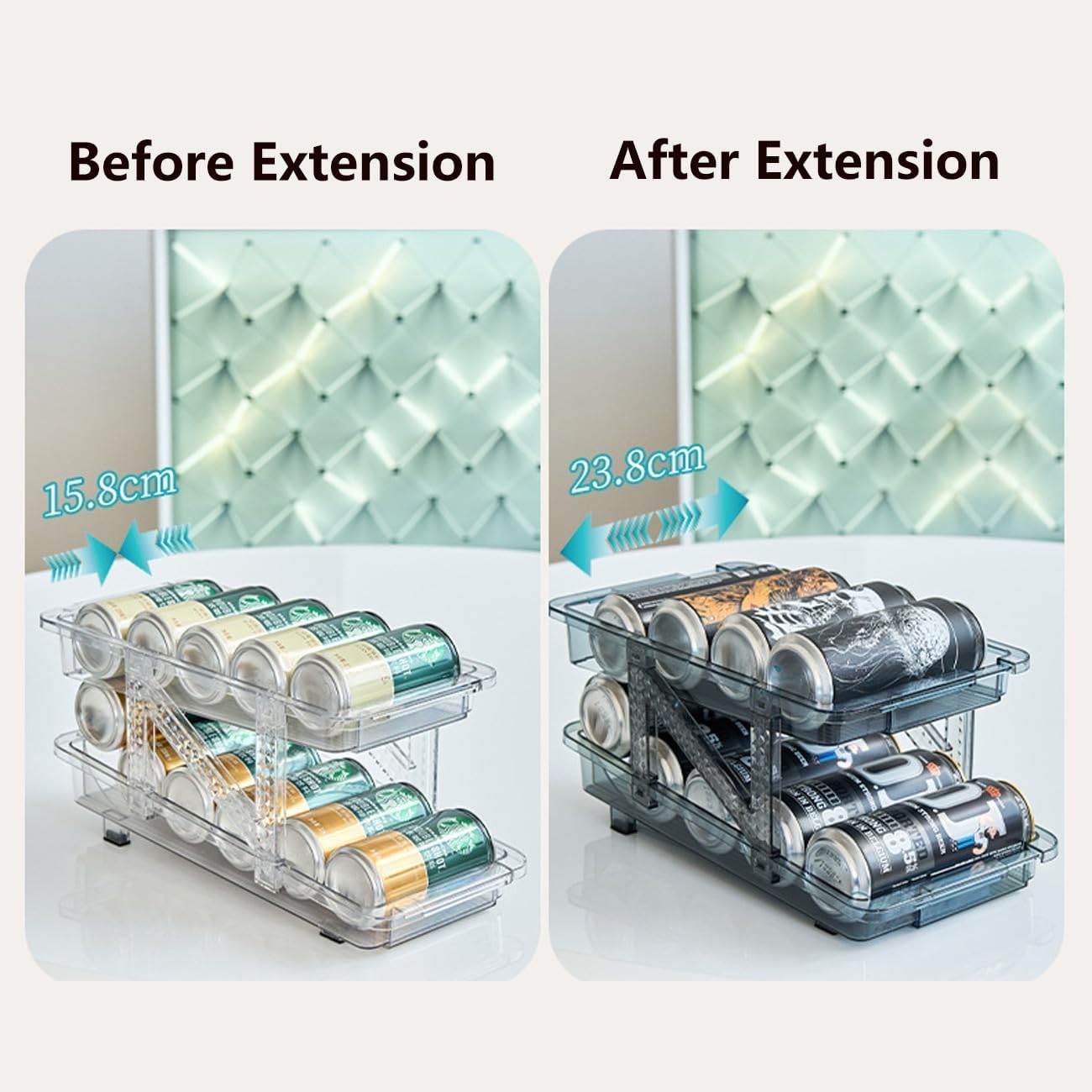Product Name: Aniced Adjustable Width Soda Can Dispenser for Refrigerator Product Attributes: Type: Soda can organizer, pull-out drink dispenser Material: Durable Plastic Design: Adjustable width organizer with two-tier auto-rotating slope Dimensions: Adjustable width up to 9.4"; Overall size: 6.4" x 14" Options: 1-Pack or 2-Pack | Colors: Transparent, Blue Key Traits: Space-saving, easy loading, versatile, durable construction Key Features: Adjustable Width Pull-Out & Auto-Rotating Design Space-Saving Design Widely Applicable Sturdy & Easy to Use Equally brilliant for: Creating an organized beverage station in your kitchen refrigerator. Saving valuable space in pantry cabinets or shelving units. Keeping office break rooms tidy and efficient. Any setting that requires a smart, pull-out soda can dispenser for easy drink access.