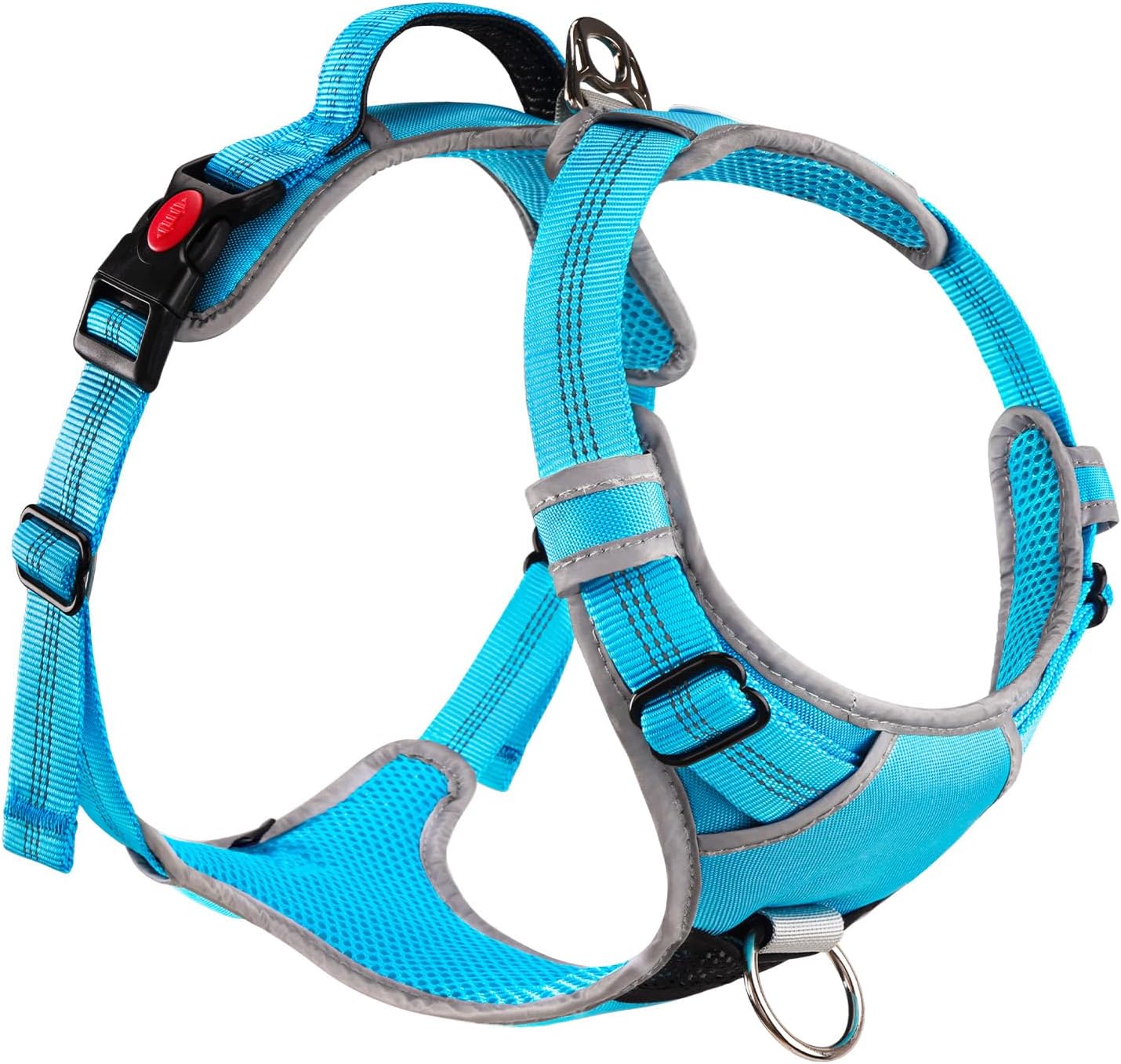 ThinkPet No-Pull Adjustable Dog Harness, Designed for Your Dog, and You! Use with ThinkPet Shock Absorbing 20" Leash / B07FNN9W8V, a great harness set for large breeds that are learning not to pull Many dogs tend to pull a lot when excited to feel nature or meet new furry friends. Our harness features an anti-pull design so you can have better control of your dog by attaching the leash to the front clip. Every time your dog pulls, he would turn around instead of continuing forward and pulling on the leash. Your dog will soon learn not to pull. The soft and breathable padding will give your dog a perfect fit around the whole body, so your dog will feel safe and comfortable while wearing it, making walking even more enjoyable.